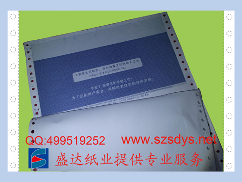 工藝:職工薪資單紙為一份三聯(lián)無(wú)碳紙,紙質(zhì)有55克及80克任客戶選擇,職工薪資單紙版面內(nèi)容可按客戶要求排版,印刷上單位標(biāo)志及單位名稱中英文、注意事項(xiàng)等要求內(nèi)容。常用尺寸為:93*217mm、140*241mm。四周通過(guò)有色膠粘接、正反面通過(guò)印刷保密底紋、保密效果好。通過(guò)對(duì)電腦紙涂膠粘合及相關(guān)部位的增感油墨或減感油墨的印刷,實(shí)現(xiàn)員工薪酬明細(xì)信息的保密。有多種版式、保密花紋可選用,通過(guò)針式打印機(jī)套打使用。職工薪資單紙具有無(wú)碳復(fù)寫、電腦連續(xù)打印、私人信息保密功能。為確保職工薪資單紙?jiān)趥鬟f或郵寄時(shí)的保密,收件人必需沿三邊刀位撕開此產(chǎn)品,方能審閱內(nèi)里的資料。