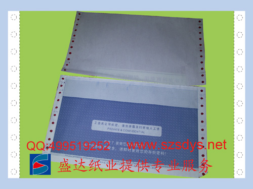 工藝:密封薪資單紙為一份三聯(lián)無碳紙,紙質(zhì)有55克及80克任客戶選擇,密封薪資單紙版面內(nèi)容可按客戶要求排版,印刷上單位標(biāo)志及單位名稱中英文、注意事項等要求內(nèi)容。常用尺寸為:93*217mm、140*241mm。四周通過有色膠粘接、正反面通過印刷保密底紋、保密效果好。通過對電腦紙涂膠粘合及相關(guān)部位的增感油墨或減感油墨的印刷,實現(xiàn)員工薪酬明細(xì)信息的保密。有多種版式、保密花紋可選用,通過針式打印機(jī)套打使用。密封薪資單紙具有無碳復(fù)寫、電腦連續(xù)打印、私人信息保密功能。為確保密封薪資單紙在傳遞或郵寄時的保密,收件人必需沿三邊刀位撕開此產(chǎn)品,方能審閱內(nèi)里的資料。