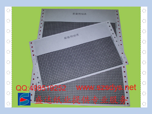 工藝:薪資通知單為一份三聯(lián)無(wú)碳紙,紙質(zhì)有55克及80克任客戶(hù)選擇,薪資通知單版面內(nèi)容可按客戶(hù)要求排版,印刷上單位標(biāo)志及單位名稱(chēng)中英文、注意事項(xiàng)等要求內(nèi)容。常用尺寸為:93*217mm、140*241mm。四周通過(guò)有色膠粘接、正反面通過(guò)印刷保密底紋、保密效果好。通過(guò)對(duì)電腦紙涂膠粘合及相關(guān)部位的增感油墨或減感油墨的印刷,實(shí)現(xiàn)員工薪酬明細(xì)信息的保密。有多種版式、保密花紋可選用,通過(guò)針式打印機(jī)套打使用。薪資通知單具有無(wú)碳復(fù)寫(xiě)、電腦連續(xù)打印、私人信息保密功能。為確保薪資通知單在傳遞或郵寄時(shí)的保密,收件人必需沿三邊刀位撕開(kāi)此產(chǎn)品,方能審閱內(nèi)里的資料。