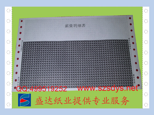 工藝:薪資單密封紙為一份三聯(lián)無碳紙,紙質(zhì)有55克及80克任客戶選擇,薪資單密封紙版面內(nèi)容可按客戶要求排版,印刷上單位標(biāo)志及單位名稱中英文、注意事項(xiàng)等要求內(nèi)容。常用尺寸為:93*217mm、140*241mm。四周通過有色膠粘接、正反面通過印刷保密底紋、保密效果好。通過對(duì)電腦紙涂膠粘合及相關(guān)部位的增感油墨或減感油墨的印刷,實(shí)現(xiàn)員工薪酬明細(xì)信息的保密。有多種版式、保密花紋可選用,通過針式打印機(jī)套打使用。薪資單密封紙具有無碳復(fù)寫、電腦連續(xù)打印、私人信息保密功能。為確保薪資單密封紙?jiān)趥鬟f或郵寄時(shí)的保密,收件人必需沿三邊刀位撕開此產(chǎn)品,方能審閱內(nèi)里的資料。