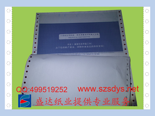 工藝:三聯(lián)薪資條紙為一份三聯(lián)無碳紙,紙質(zhì)有55克及80克任客戶選擇,三聯(lián)薪資條紙版面內(nèi)容可按客戶要求排版,印刷上單位標(biāo)志及單位名稱中英文、注意事項(xiàng)等要求內(nèi)容。常用尺寸為:93*217mm、140*241mm。四周通過有色膠粘接、正反面通過印刷保密底紋、保密效果好。通過對(duì)電腦紙涂膠粘合及相關(guān)部位的增感油墨或減感油墨的印刷,實(shí)現(xiàn)員工薪酬明細(xì)信息的保密。有多種版式、保密花紋可選用,通過針式打印機(jī)套打使用。三聯(lián)薪資條紙具有無碳復(fù)寫、電腦連續(xù)打印、私人信息保密功能。為確保三聯(lián)薪資條紙?jiān)趥鬟f或郵寄時(shí)的保密,收件人必需沿三邊刀位撕開此產(chǎn)品,方能審閱內(nèi)里的資料。