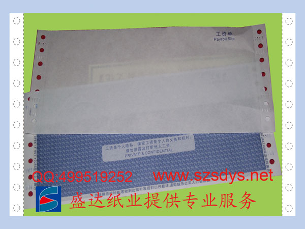 工藝:工資紙為一份三聯(lián)無碳紙,紙質(zhì)有55克及80克任客戶選擇,工資紙版面內(nèi)容可按客戶要求排版,印刷上單位標(biāo)志及單位名稱中英文、注意事項(xiàng)等要求內(nèi)容。常用尺寸為:93*217mm、140*241mm。四周通過有色膠粘接、正反面通過印刷保密底紋、保密效果好。通過對(duì)電腦紙涂膠粘合及相關(guān)部位的增感油墨或減感油墨的印刷,實(shí)現(xiàn)員工薪酬明細(xì)信息的保密。有多種版式、保密花紋可選用,通過針式打印機(jī)套打使用。工資紙具有無碳復(fù)寫、電腦連續(xù)打印、私人信息保密功能。為確保工資單紙?jiān)趥鬟f或郵寄時(shí)的保密,收件人必需沿三邊刀位撕開此產(chǎn)品,方能審閱內(nèi)里的資料。