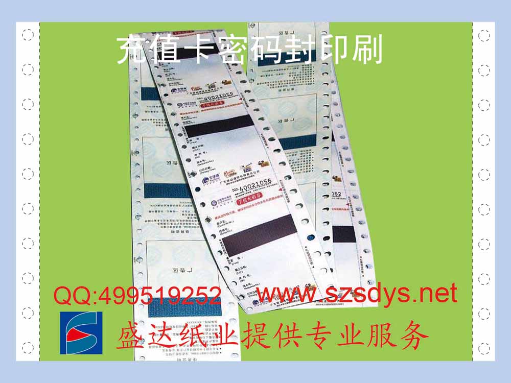 深圳盛達印刷廠專業(yè)印刷移動密碼充值券。密碼封。產(chǎn)品保密函紙,產(chǎn)品信息密碼函紙。數(shù)據(jù)保密信封,數(shù)字密碼信封,密封函紙 。本系列產(chǎn)品適用于各企業(yè)產(chǎn)品,產(chǎn)品,商品,數(shù)據(jù),數(shù)據(jù),密碼等重要資料內(nèi)容的傳遞及保護。提供多種規(guī)格、1至3聯(lián),具有無碳復(fù)寫、電腦連續(xù)打印、私人信息保密功能。為確保私隱資料及機密文件在傳遞或郵寄時的保密,收件人必需沿三邊刀位撕開此產(chǎn)品,方能審閱內(nèi)里的資料。如薪俸表,保密薪資單,工資袋及私人密碼,銀行密碼信封。企業(yè)員工的保密薪資單(袋)、銀行卡配套的密碼信封,通過對電腦紙涂膠粘合及相關(guān)部位的增感油墨或減感油墨的印刷,實現(xiàn)薪資及密碼信息的保密。有多種版式、保密花紋可選用,也可按客戶要求設(shè)計制作,美觀適用。電腦直接打印薪資、密碼,效率高。需撕開密封口方可閱讀薪資、密碼內(nèi)容,保密性強,全國提供發(fā)貨上門,最優(yōu)質(zhì)的誠信服務(wù)!