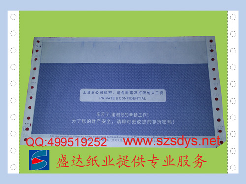 工藝:機(jī)打工資單紙為一份三聯(lián)無(wú)碳紙,紙質(zhì)有55克及80克任客戶選擇,機(jī)打工資單紙版面內(nèi)容可按客戶要求排版,印刷上單位標(biāo)志及單位名稱中英文、注意事項(xiàng)等要求內(nèi)容。常用尺寸為:93*217mm、140*241mm。四周通過(guò)有色膠粘接、正反面通過(guò)印刷保密底紋、保密效果好。通過(guò)對(duì)電腦紙涂膠粘合及相關(guān)部位的增感油墨或減感油墨的印刷,實(shí)現(xiàn)員工薪酬明細(xì)信息的保密。有多種版式、保密花紋可選用,通過(guò)針式打印機(jī)套打使用。機(jī)打工資單紙具有無(wú)碳復(fù)寫、電腦連續(xù)打印、私人信息保密功能。為確保機(jī)打工資單紙?jiān)趥鬟f或郵寄時(shí)的保密,收件人必需沿三邊刀位撕開(kāi)此產(chǎn)品,方能審閱內(nèi)里的資料。
