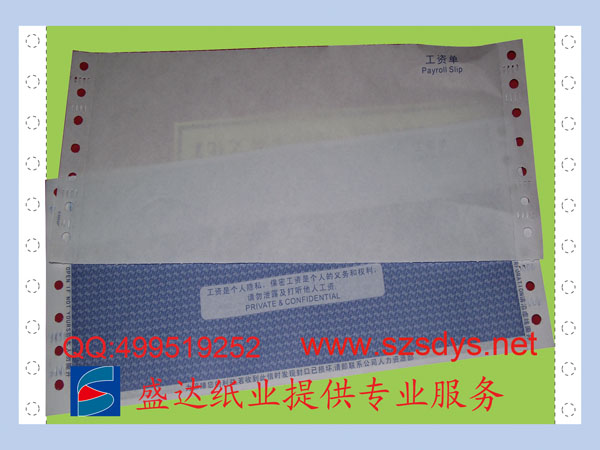 工藝:工資單密封紙為一份三聯(lián)無碳紙,紙質(zhì)有55克及80克任客戶選擇,工資單密封紙版面內(nèi)容可按客戶要求排版,印刷上單位標志及單位名稱中英文、注意事項等要求內(nèi)容。常用尺寸為:93*217mm、140*241mm。四周通過有色膠粘接、正反面通過印刷保密底紋、保密效果好。通過對電腦紙涂膠粘合及相關(guān)部位的增感油墨或減感油墨的印刷,實現(xiàn)員工薪酬明細信息的保密。有多種版式、保密花紋可選用,通過針式打印機套打使用。工資單密封紙具有無碳復寫、電腦連續(xù)打印、私人信息保密功能。為確保工資單密封紙在傳遞或郵寄時的保密,收件人必需沿三邊刀位撕開此產(chǎn)品,方能審閱內(nèi)里的資料。