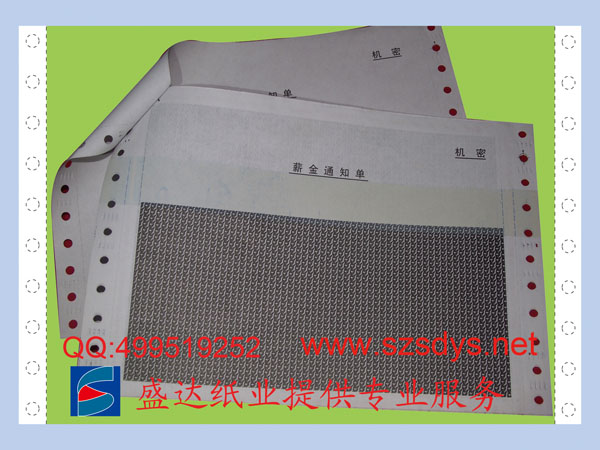 工藝:工資密碼封為一份三聯(lián)無(wú)碳紙,紙質(zhì)有55克及80克任客戶選擇,工資密碼封版面內(nèi)容可按客戶要求排版,印刷上單位標(biāo)志及單位名稱中英文、注意事項(xiàng)等要求內(nèi)容。常用尺寸為:93*217mm、140*241mm。四周通過(guò)有色膠粘接、正反面通過(guò)印刷保密底紋、保密效果好。通過(guò)對(duì)電腦紙涂膠粘合及相關(guān)部位的增感油墨或減感油墨的印刷,實(shí)現(xiàn)員工薪酬明細(xì)信息的保密。有多種版式、保密花紋可選用,通過(guò)針式打印機(jī)套打使用。工資密碼封具有無(wú)碳復(fù)寫(xiě)、電腦連續(xù)打印、私人信息保密功能。為確保工資密碼封在傳遞或郵寄時(shí)的保密,收件人必需沿三邊刀位撕開(kāi)此產(chǎn)品,方能審閱內(nèi)里的資料。